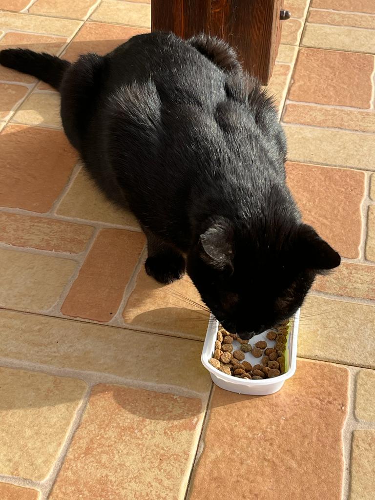 I was watching the cat eat its food. When I got up this morning, the dish was empty – I had filled it up last night, so I filled it again and then while making my tea I felt this soft little black cat rubbing against my legs. He was happy to eat most of the food in the dish that I put out this morning. And then he came in as I was pouring milk into my tea and I gave him a little bit.  I know he’s probably too old to have milk, but it was just something that I used to do when I was a kid. Now he’s wandering around the house miaoing. I don’t know but maybe there was somebody here before that he liked as well. Â