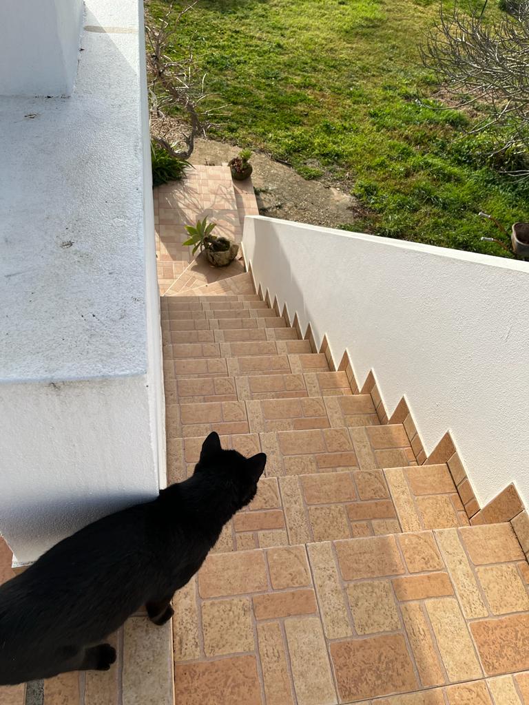 The cat ran up the stairs to the side of the house and I thought, oh, what’s up there? I haven’t been up there. I don’t know why – I mean I come out the front door and look to the right- the stairs are right there as I walk out the front door, so I went up. There’s a lovely tiled deck with a wall around it and you can see over the top of the roof and actually, quite a nice view of the property around it. The owner told me that’s where his storage is so I wasn’t expecting that.  The other side of the house that he rents out has a cathedral ceiling and then an upper loft with a bedroom so there’s one bedroom down below. That’s the house I was supposed to have and apparently,  I’m to move in there sometime at the end of this month and then if I like, I can come back to this one. I rented the other house originally. I didn’t know that but Luis just felt , because it was cool at night, I would be better with the fireplace .Â